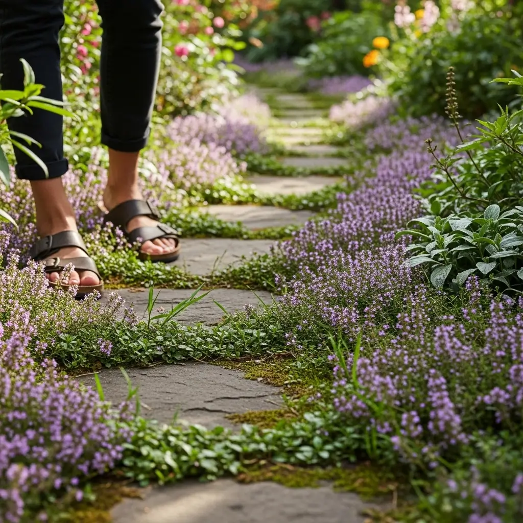 In a chaos garden, pathways don’t need perfect edges. Let ground covers like creeping thyme or ajuga wander into the paths.