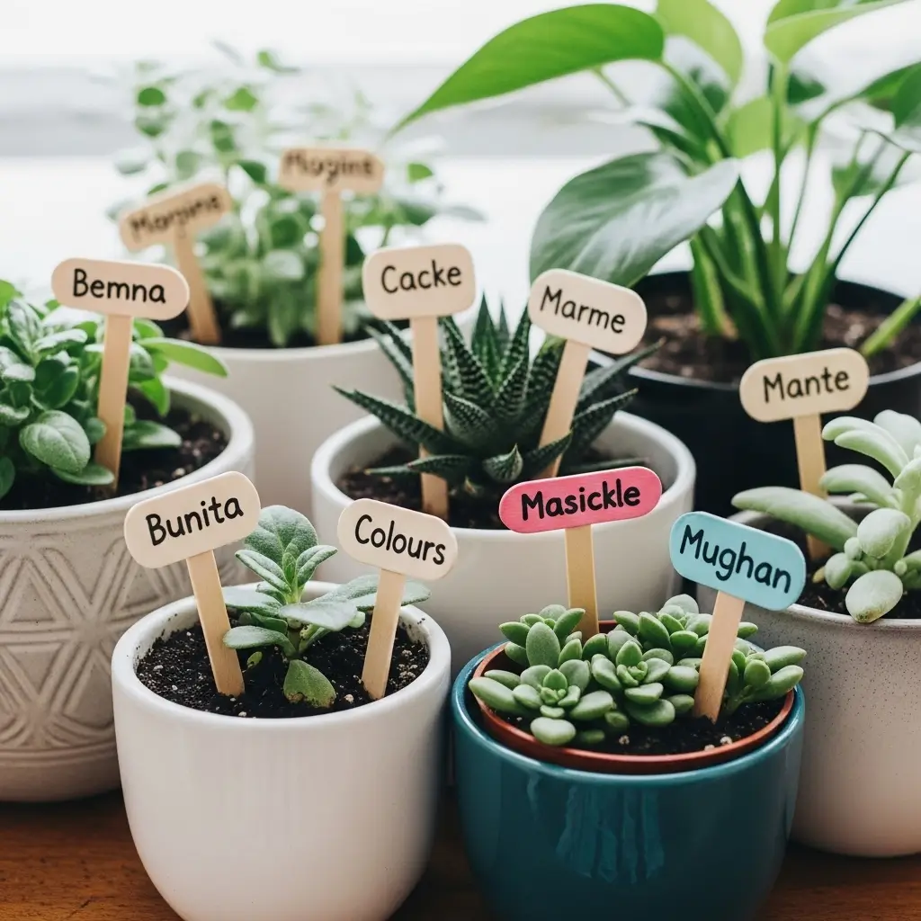Plant markers make your indoor garden playful and organized. Use wooden sticks, popsicle sticks, or clay tags, and decorate them with plant names, colors, or tiny drawings.