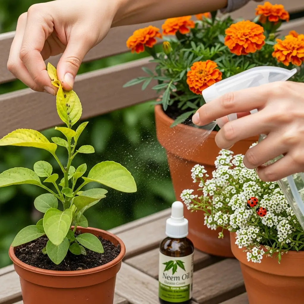 Remove damaged leaves, spray with soapy water for soft-bodied insects, and use neem oil if needed. You can also plant flowers that attract helpful insects like ladybugs.