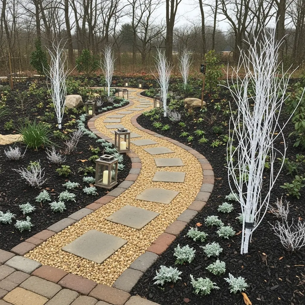 Combine stones, gravel, mulch, or wood for a playful, textured pathway. Mixing materials adds visual interest and makes the path a focal point in your winter garden.