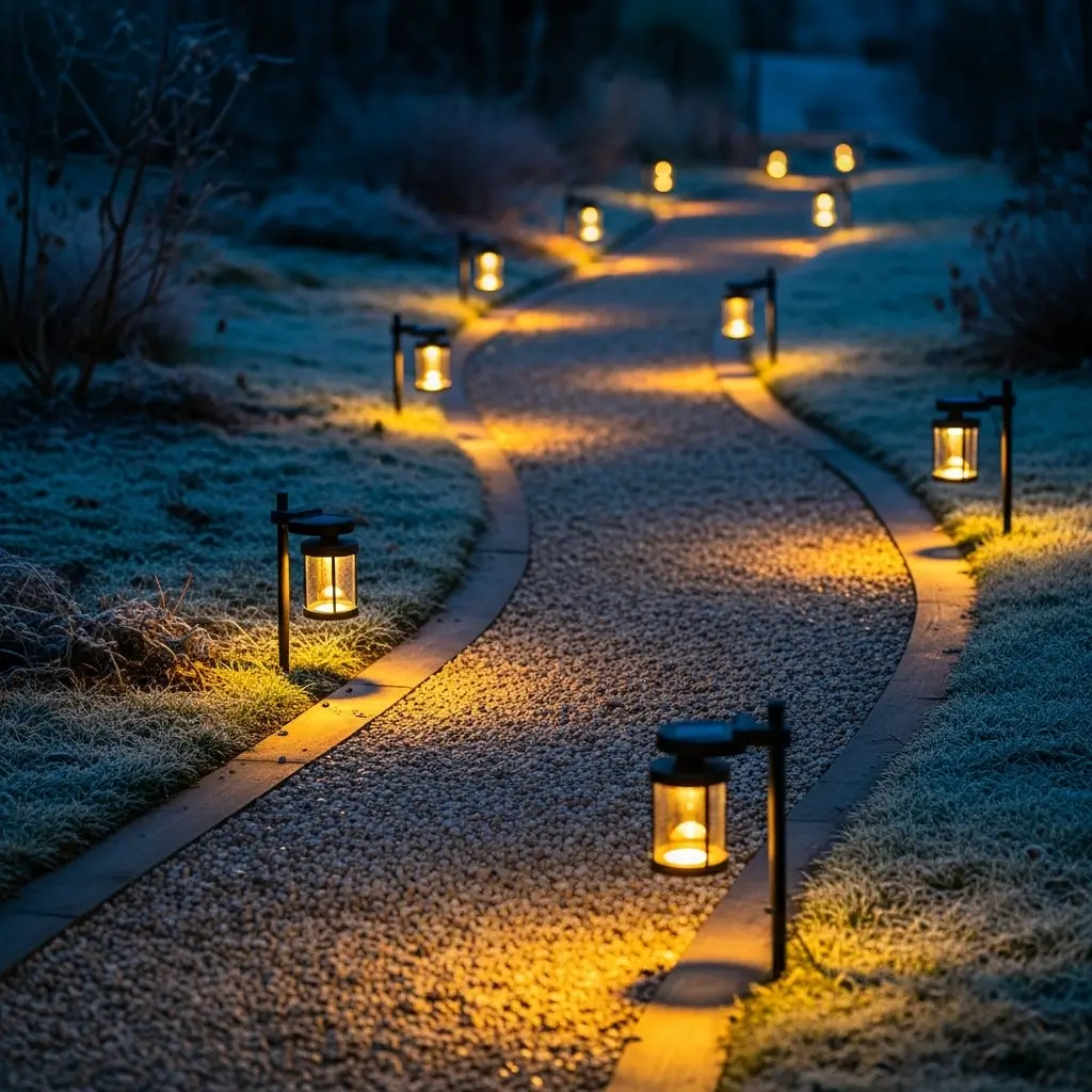 Adding lights can transform a simple winter path into a magical walkway. String lights, lanterns, or solar-powered stakes highlight curves and edges, guiding visitors safely through the garden.