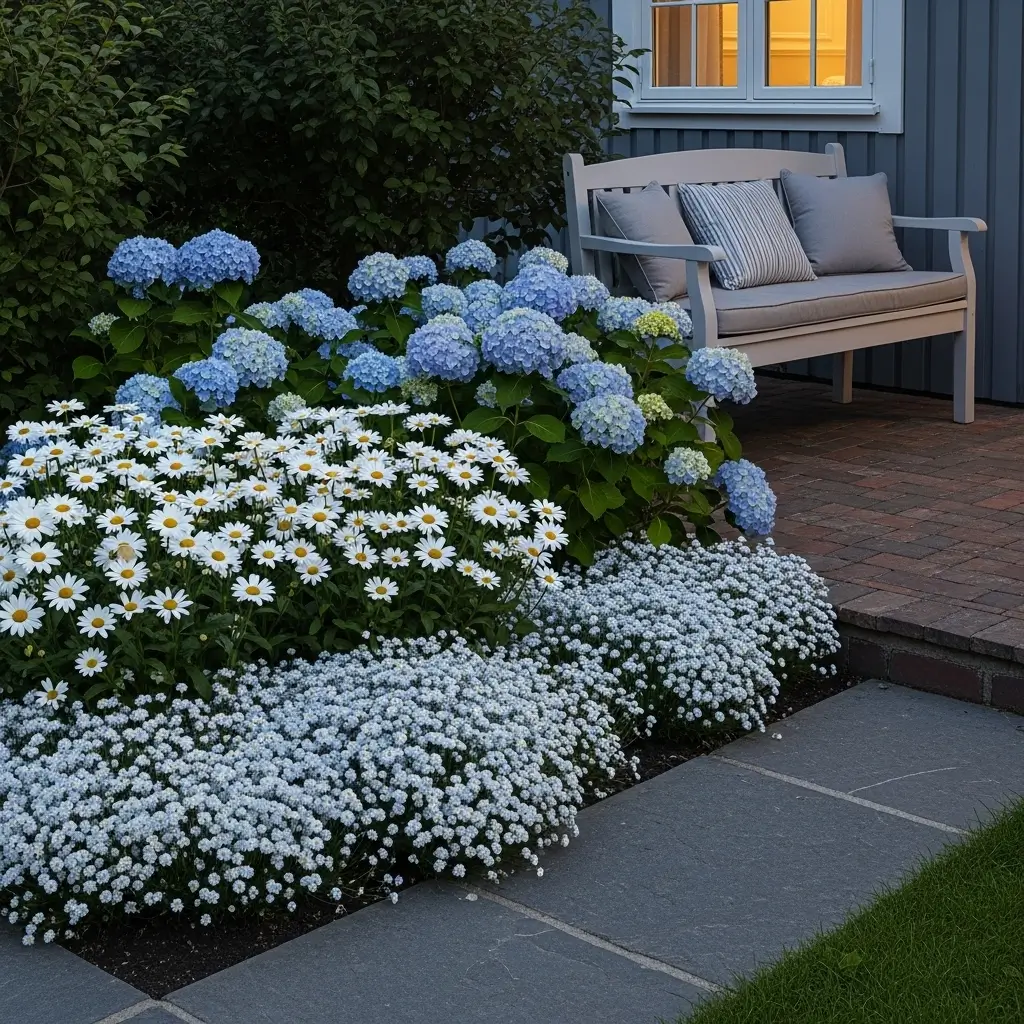 I planted white daisies and pale blue hydrangeas near my seating nook, and they glow softly at night. Light-colored blooms reflect the moon, making your garden look brighter and more magical.