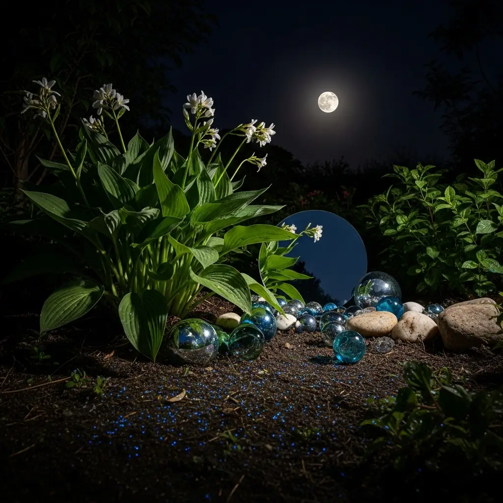 Mirrors, glass ornaments, or shiny stones can bounce moonlight around your garden. I placed a small mirror behind some plants, and it doubled the glow from the moon, making the space feel larger and brighter.