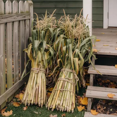 Tied cornstalk bundles add height and rustic style. Simply gather a few stalks and tie them with twine, then place them near doors, fences, or garden corners.