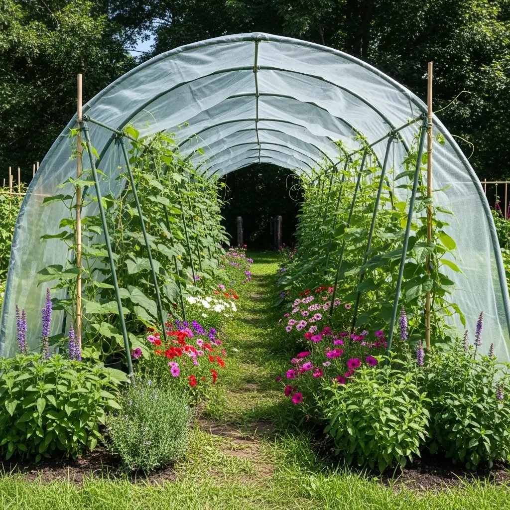 This tunnel suits busy gardeners who want beauty and productivity in one spot. Mixed plants attract pollinators, keep pests away, and make the tunnel look full and lively.