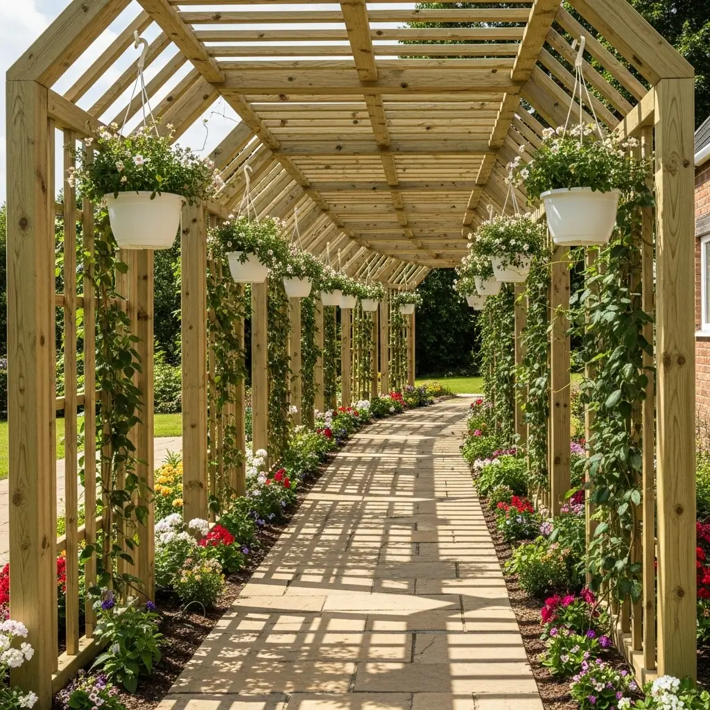 A wooden slat tunnel creates a warm, cozy feeling. Slats give plants plenty of places to climb, making it great for flowers, vines, or hanging plants.