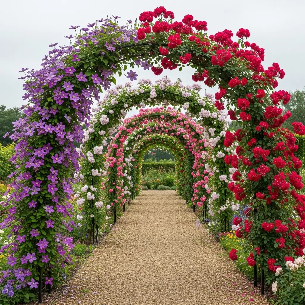 A flower tunnel brings color, fragrance, and beauty. Clematis adds bright flowers, and climbing roses bring full blooms and rich scent.
