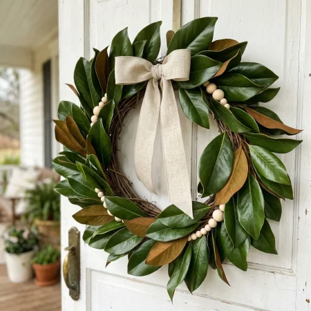 Many people add neutral wood beads or a linen bow to keep the look modern and understated. This design works well year-round because the deep green leaves feel fresh in spring but still suit fall and winter decor.
